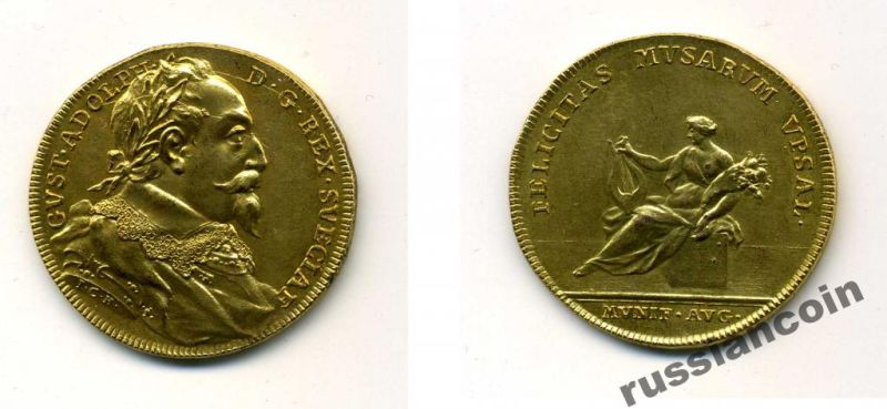 -----Швеция медаль в честь пожертвования Густавом II Адольфом фамильных владений (земельных участков, домов и т.п.) университету Уппсалы 31 августа 1624, 1733 медальер Гедлингер позолоченная бронза 00-817-56