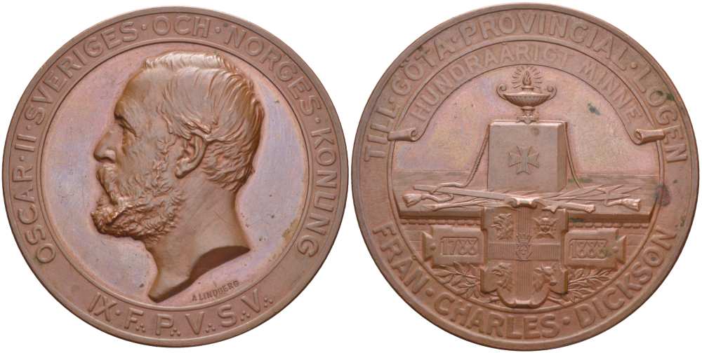 Швеция медаль 1888 Оскар II король Швеции и Норвегии, 100 лет великой масонской ложи, в провинциальную ложу Гета, от Чарльза Диксона (Charles Dickson), 56 мм., 80,42 гр. бронза 1084-3-41