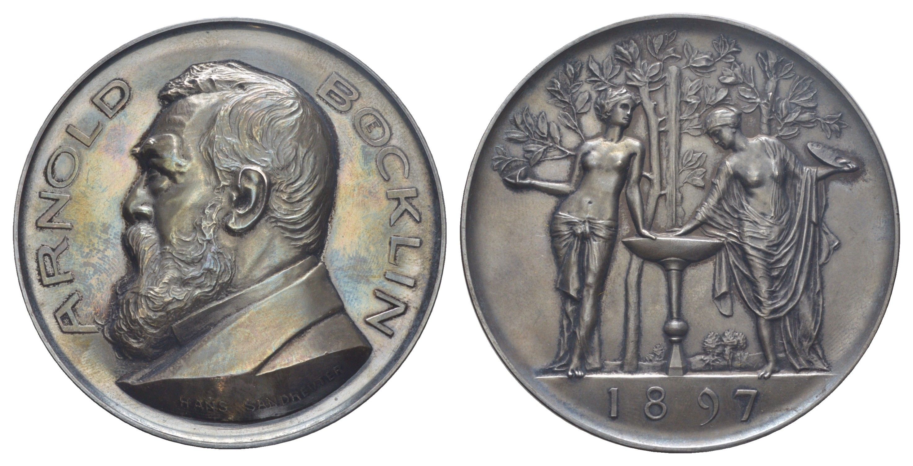 Швейцария медаль "Арнольд Бёклин" 1897 Арнольд Бёклин - швейцарский художник, 70 лет со дня рождения, отчеканена компанией Hugenen fr?res по рисунку Ганс Зандрёйтер в 1897, поэзия и живопись стоят перед лавровыми деревьями у фонтана, в красочной коробке, диаметр 71 мм, вес 166,4 гр Winterstein 427b, Leu 1225 железо 6-6-2-02