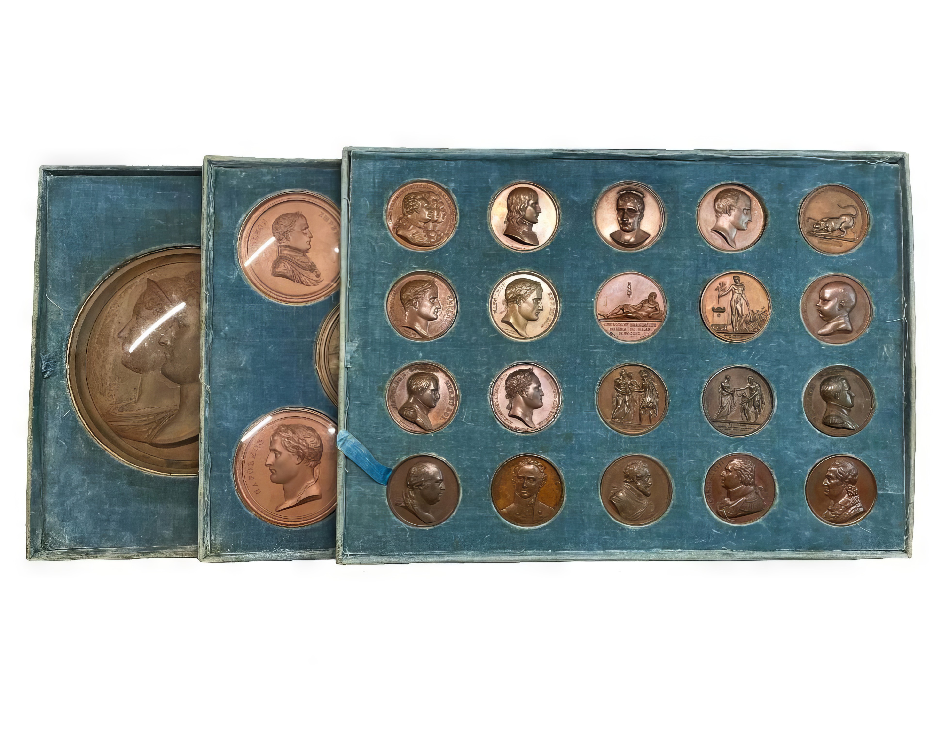 Некоторые из медалей содержат подписи (клейма) медальеров Парижского монетного двора – Бертрана Андрийе и Николя Брене. В наборе 20 медалей и 10 односторонних медальонов с куполом из стекла.