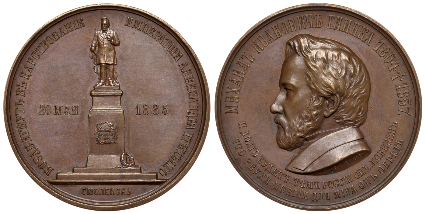 Россия медаль 1885 медаль в память открытия памятника М.И. Глинке в г. Смоленске, 66,77 гр, 51,3 мм Дьяков 959.1 R бронза aUNC 10-011-09