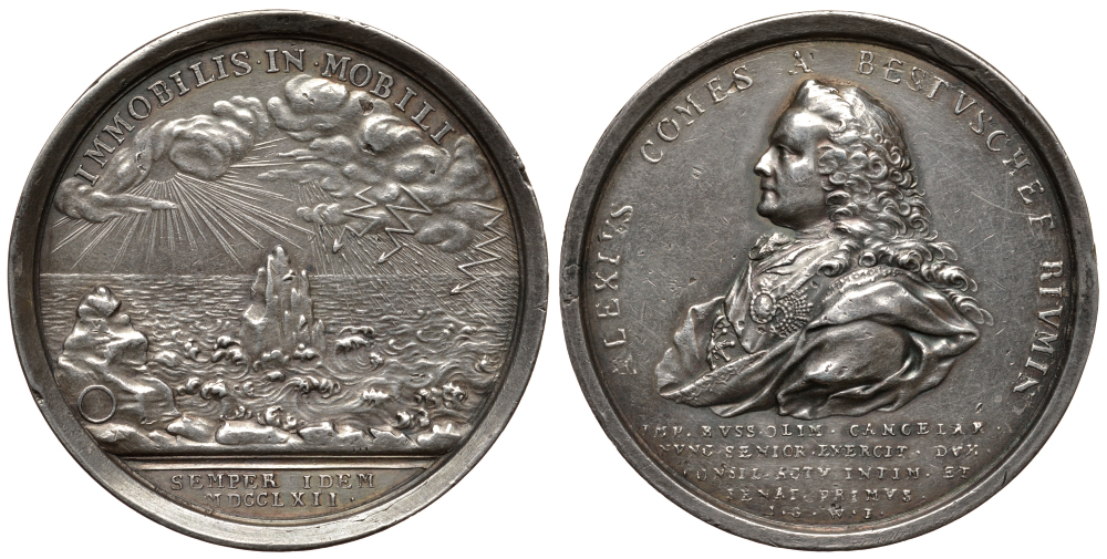 Россия медаль 1762 на назначение графа Бестужева-Рюмина фельдмаршалом, 52,1 мм, 59,4 гр Дьяков 111.1 R3 серебро 10-009-37
