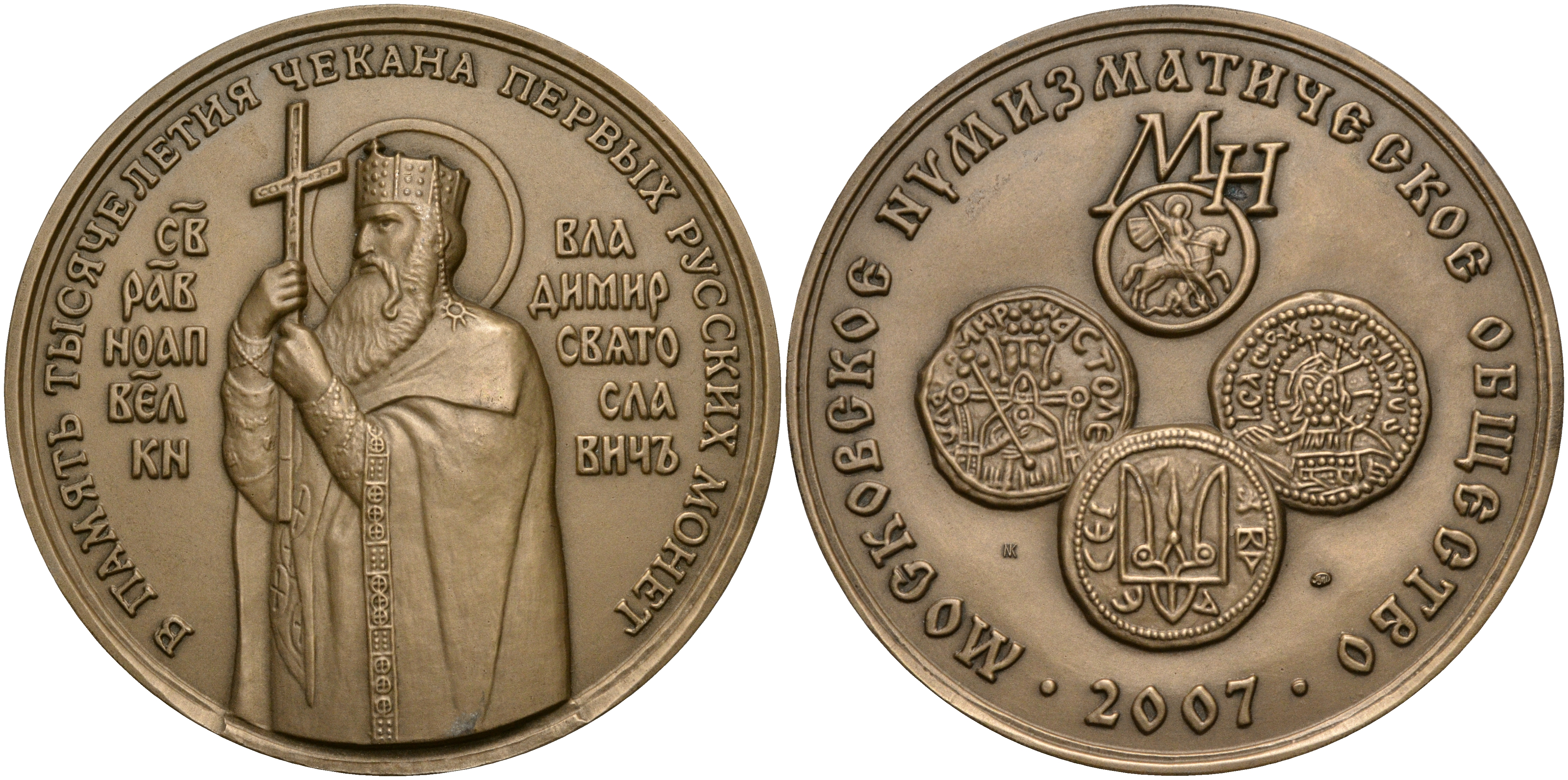 Россия медаль 2007 МНО, В ПАМЯТЬ ТЫСЯЧЕЛЕТИЯ ЧЕКАНА ПЕРВЫХ РУССКИХ МОНЕТ, СВЯТОЙ РАВНООПОСТОЛЬНЫЙ ВЕЛИКИЙ КНЯЗЬ ВЛАДИМИР СВЯТОСЛАВОВИЧ, ММД, ДИАМЕТР 70 ММ. томпак UNC 01-021-21-1