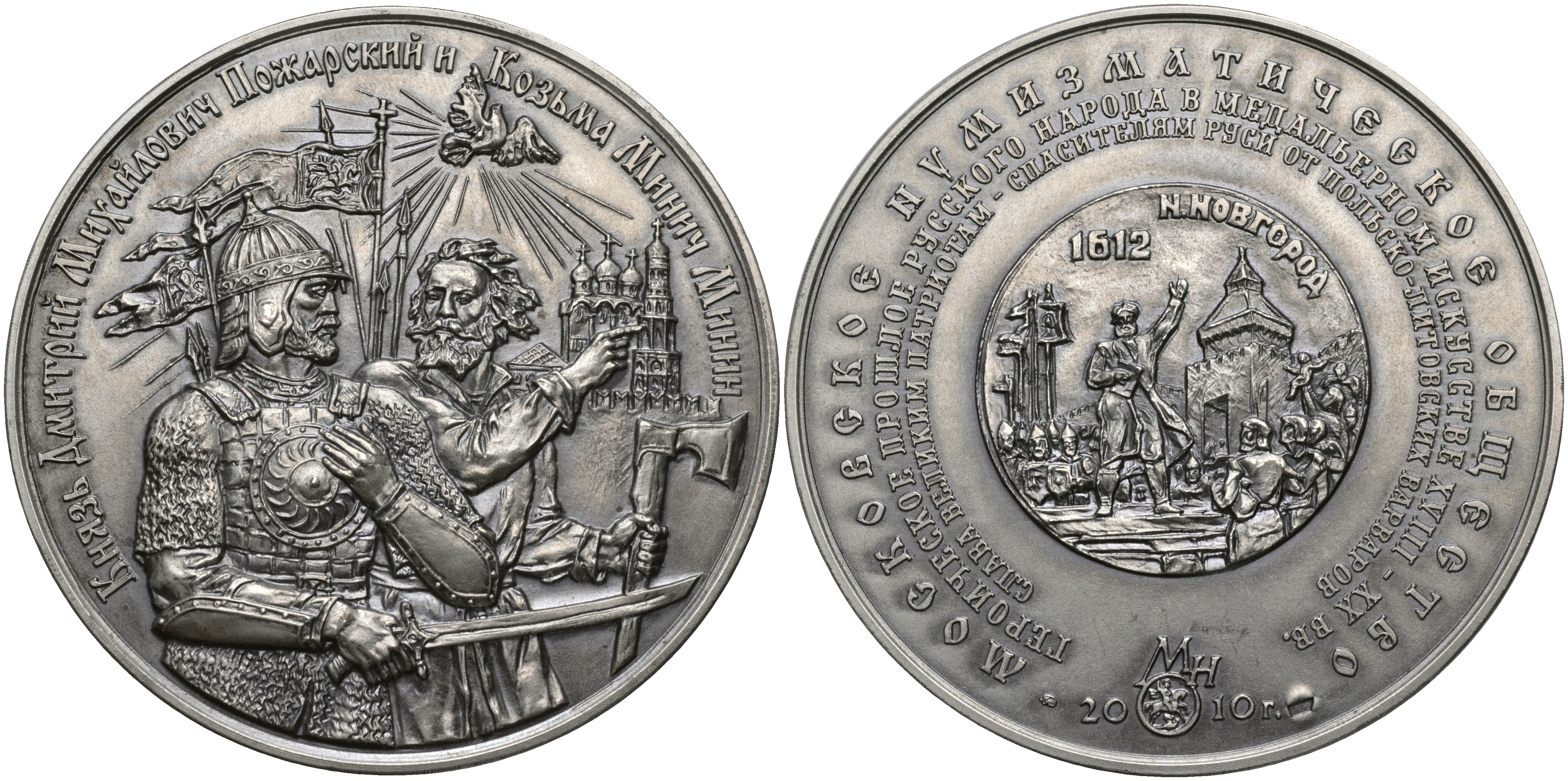 Россия медаль 2010 МНО, князь Дмитрий Иванович Пожарский и Козьма Минич Минин, ММД, диаметр 70 мм, проба 925, № 15 серебро UNC 00-000-00