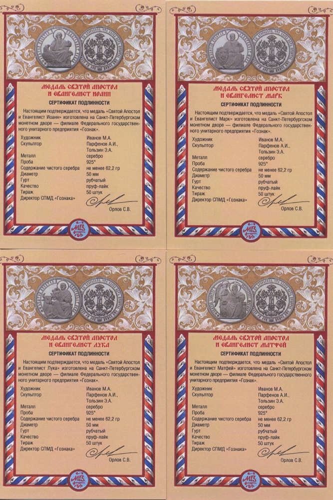 Россия набор из 4 медалей весом 62,2 грамма Святые Апостолы и Евангелисты, в оригинальной коробке с сертификатами серебро 14-01-04-05