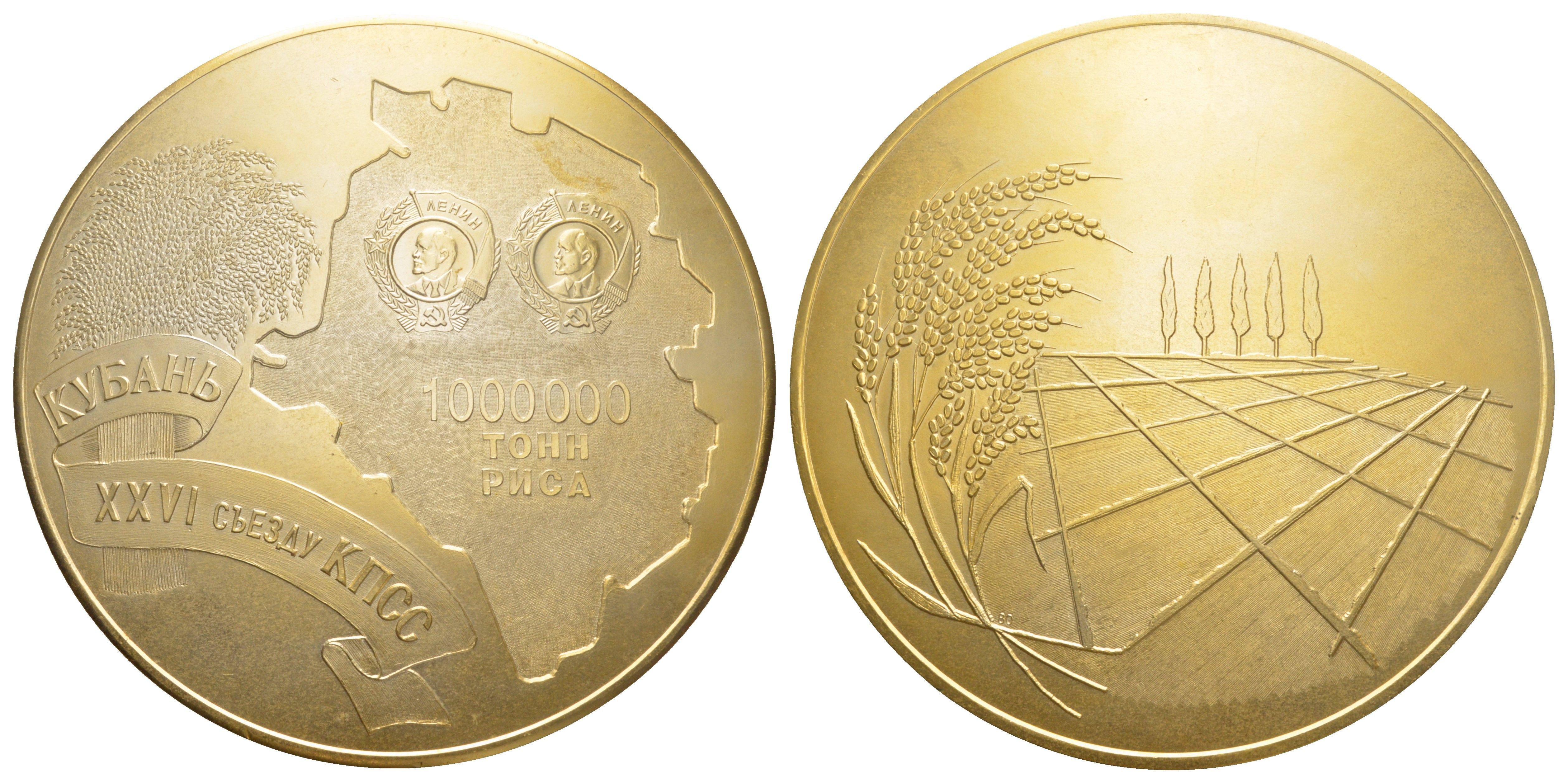 -----СССР медаль "1 000 000 тонн риса, Кубань XXVI съезду КПСС" 1980 вес 400 гр, диаметр 149 см, тощина 8,5 мм томпак 3-5-3-26