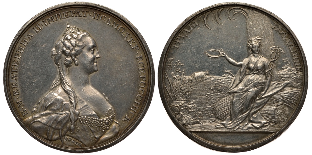 ---Россия медаль до 1768 Вольное экономическое общество, за труды воздаяние, 39,2 мм, 34,1 гр Дьяков 142.8 R1 серебро 10-005-64