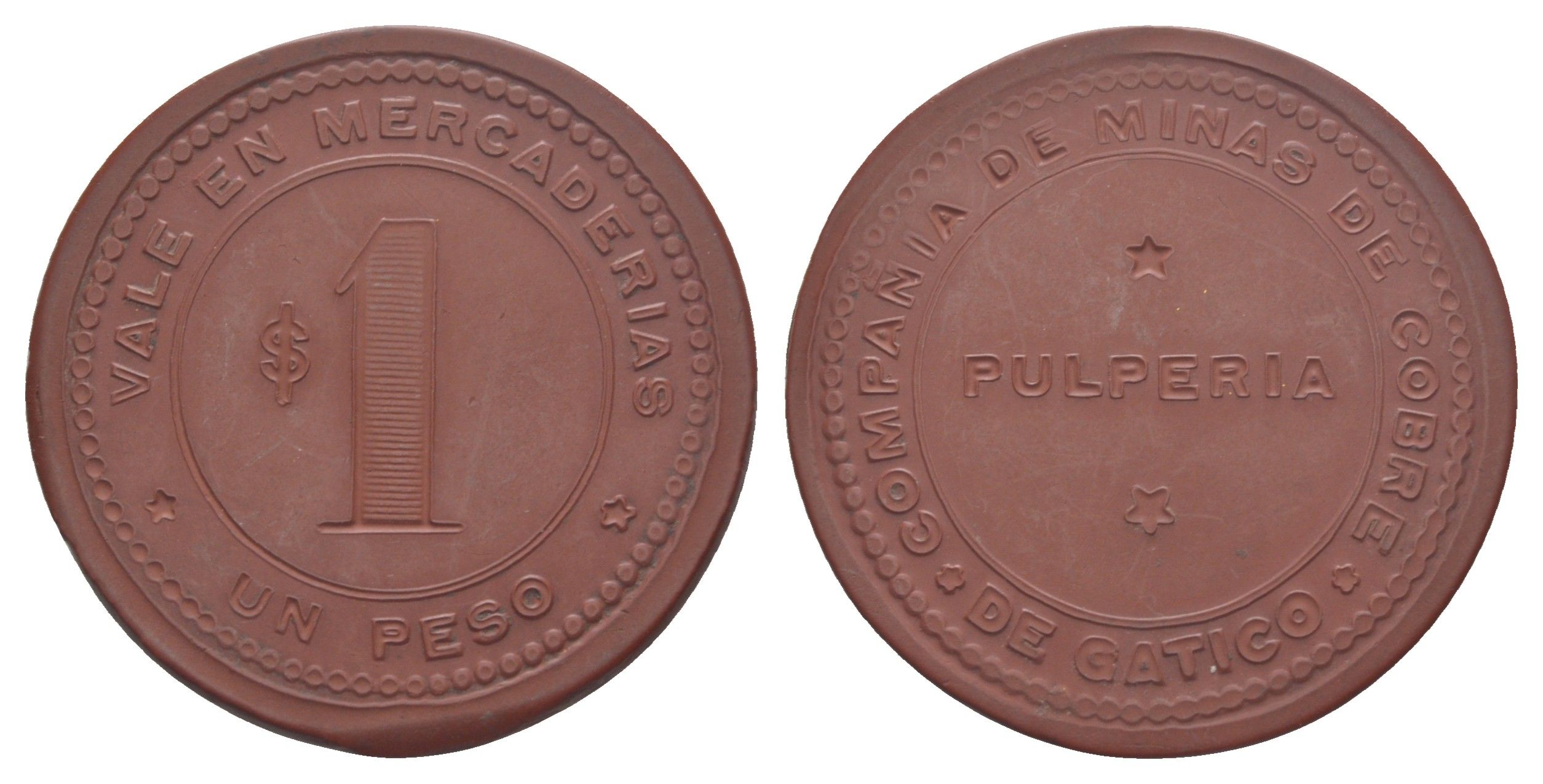 -----Чили, компании Gatito шахтерский жетон с Медного рудника для покупки в местных магазинах, номиналом в 1 песо конец XIX века диаметр 40 мм, вес 5,35 гр не описан в Espinosa эбонит (красный) 1066-4-55