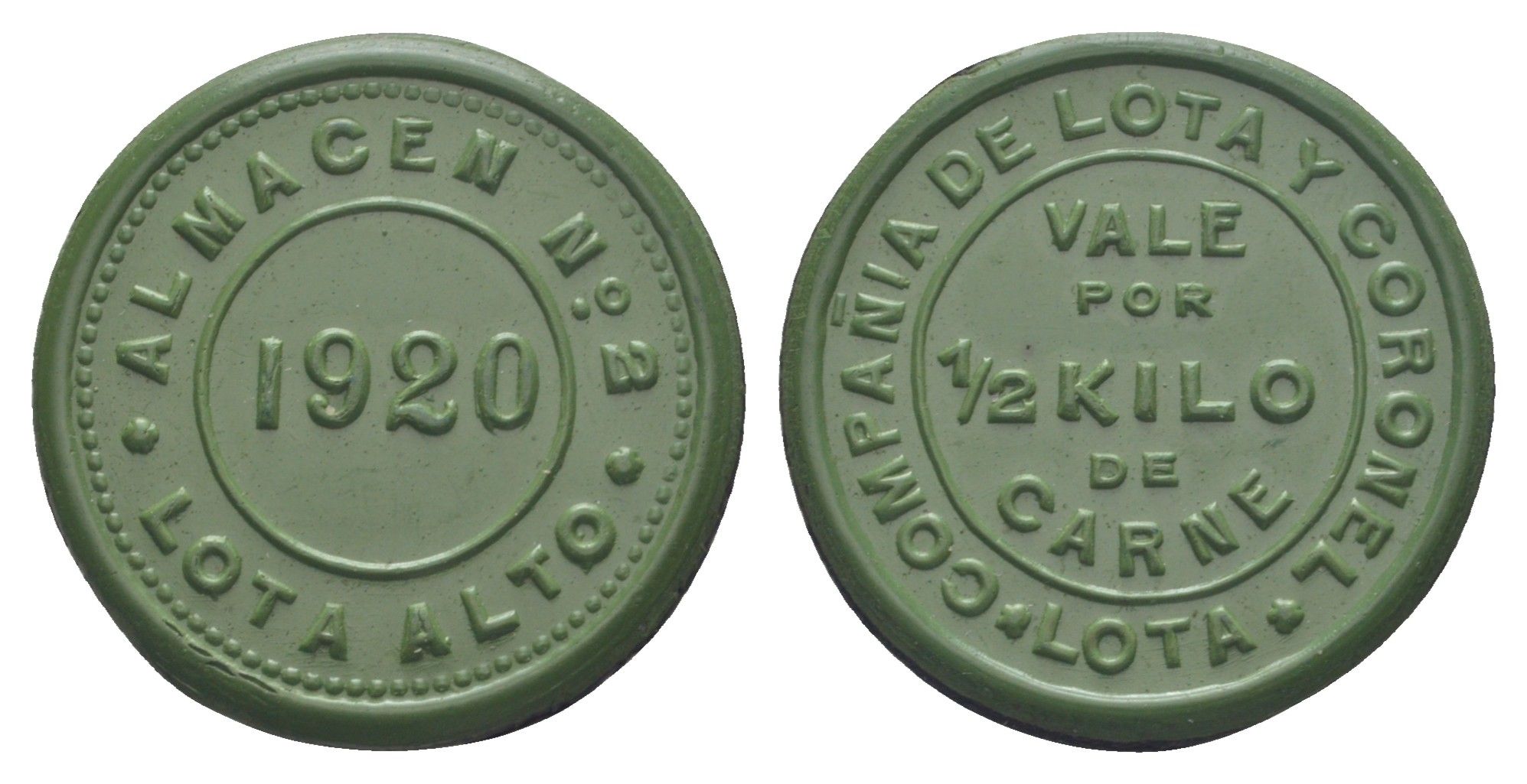 -----Чили, компании Лота и Коронель (Compania de Lota y Coronel) - Склад № 2 жетон в 1/2 килограмма мяса 1920 диаметр 30 мм, вес 4,5 гр не описан в Espinosa эбонит (зеленый) 1066-1-63