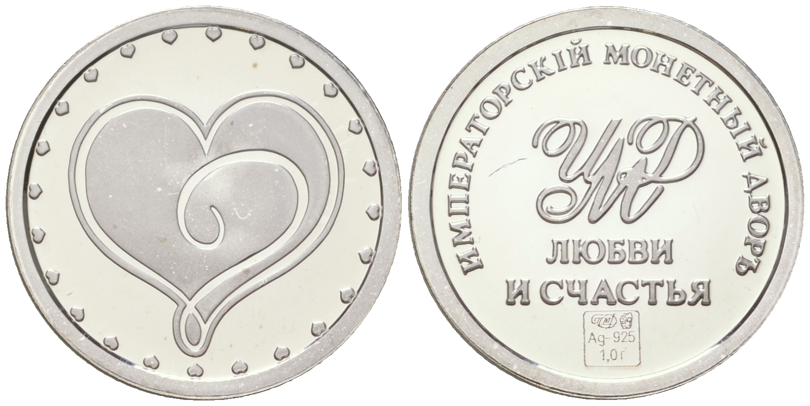 ---Россия жетон "Любви и счастья" ND императорский монетный двор, диаметр 14 мм, вес 1 гр серебро PROOF 11-083-44НовинкиАнтичность и раннее СредневековьеМонеты - ГерманияМонеты - ЕвропаМонеты - Австралия и ОкеанияМонеты - АзияМонеты - АмерикаМонеты - АфрикаМонеты - Россия, СССР, страны СНГ и БалтииБанкнотыАксессуары, ЛитератураОткрытки, карточкиАкции, облигацииЖетоны, Медали, ЗнакиМаркиКартины, декоративно-прикладное искусство
